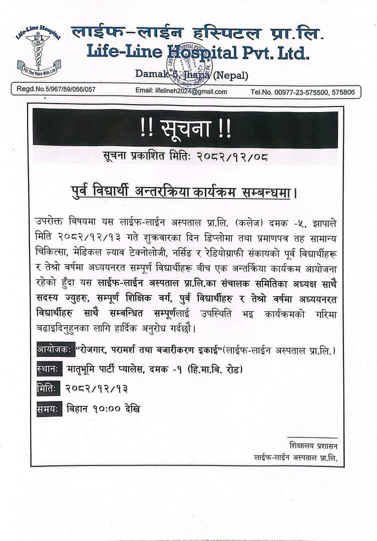 उपरोक्त बिषयमा यस लाईफ-लाईन अस्पताल प्रा.लि. (कलेज) दमक -५, झापाले मिति 2082/12/13 गते शुक्रवारका दिन डिप्लोमा तथा प्रमाणपत्र तह सामान्य चिकित्सा, मेडिकल ल्याव टेक्नोलोजी, नर्सिङ र रेडियोग्राफी संकायको पूर्व विद्यार्थीहरू र तेश्रो वर्षमा अध्ययनरत सम्पूर्ण विद्यार्थीहरू बीच एक अन्तर्क्रिया कार्यक्रम आयोजना रहेको हुँदा यस लाईफ-लाईन अस्पताल प्रा.लि.का संचालक समितिका अध्यक्ष साथै सदस्य ज्युहरु, सम्पूर्ण शिक्षिक वर्ग, पुर्व विद्यार्थीहरु र तेश्रो वर्षमा अध्ययनरत विद्यार्थीहरु साथै सम्बन्धित सम्पूर्णलाई उपस्थिति भइ कार्यक्रमको गरिमा बढाइदिनुहुनका लागि हार्दिक अनुरोध गर्दछौ।