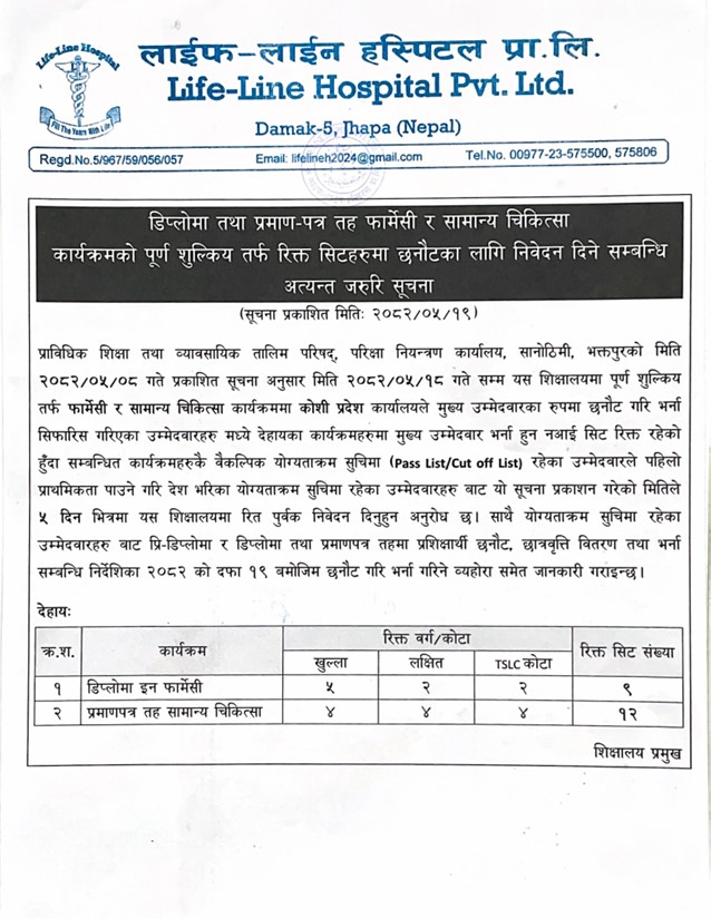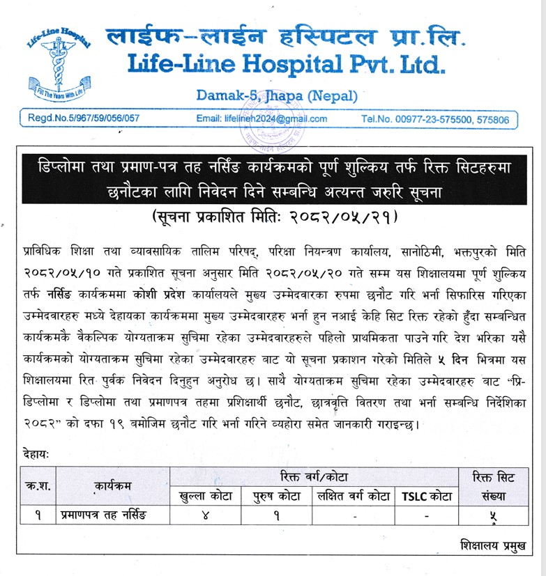 प्रमाणपत्र तह नर्सिङ कार्यक्रमको रिक्त सिटहरुमा नर्सिङ कार्यक्रम कै वैकल्पिक लिस्टका प्रशिक्षार्थीहरुले आवेदन दिने वारे जरुरि सूचना II